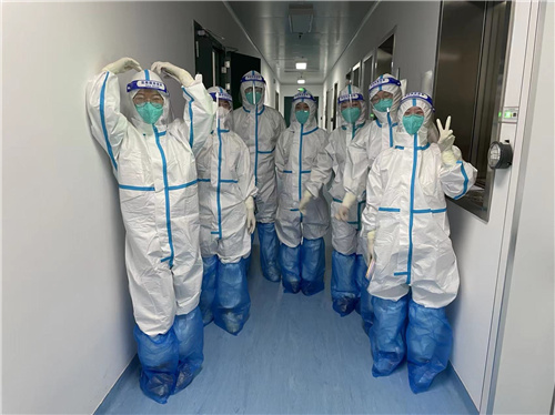随着检测工作的进行,大家拧盖子的手疼了,加样的胳膊酸了,口罩里呼吸越来越不顺畅,汗水湿透了衣服,挺直的腰也开始慢慢勾起,但是没有人抱怨,没有人退缩。每一个检验者都知道,震荡、配液、加样,每一步都关系着后续的检测结果,关系着疫情防控工作的最终胜利。大家都拿出“黄沙百战穿金甲,不破楼兰终不还”的气势和信心,埋头苦干,实验室只剩下对讲机里分区之间的沟通声和人员操作及设备运作的哒哒沙沙声。