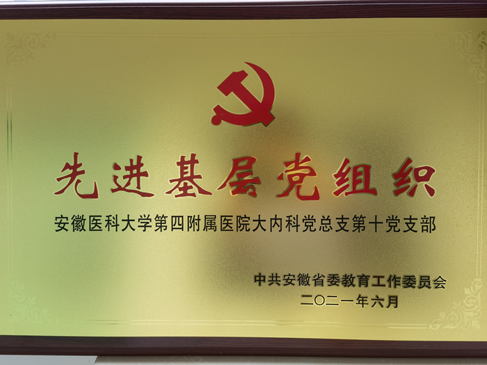 日前,省委教育工委表彰一批安徽省高校优秀共产党员、安徽省高校优秀党务工作者和安徽省高校先进基层党组织。我院内科第十党支部获“先进基层党组织”荣誉称号,也是安医大今年唯一一个被省委教育工委表彰的先进基层党组织。
