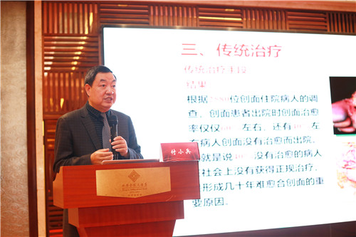 付小兵教授作题为《中国特色创面修复学科体系建设的回顾与展望》的报告,从创面治疗是国家的需求,创面流行病分析,创面治疗的模式、治疗效果等方面,展示了具有中国特色的创面修复学科体系建设发展的背景、历程和前景。
