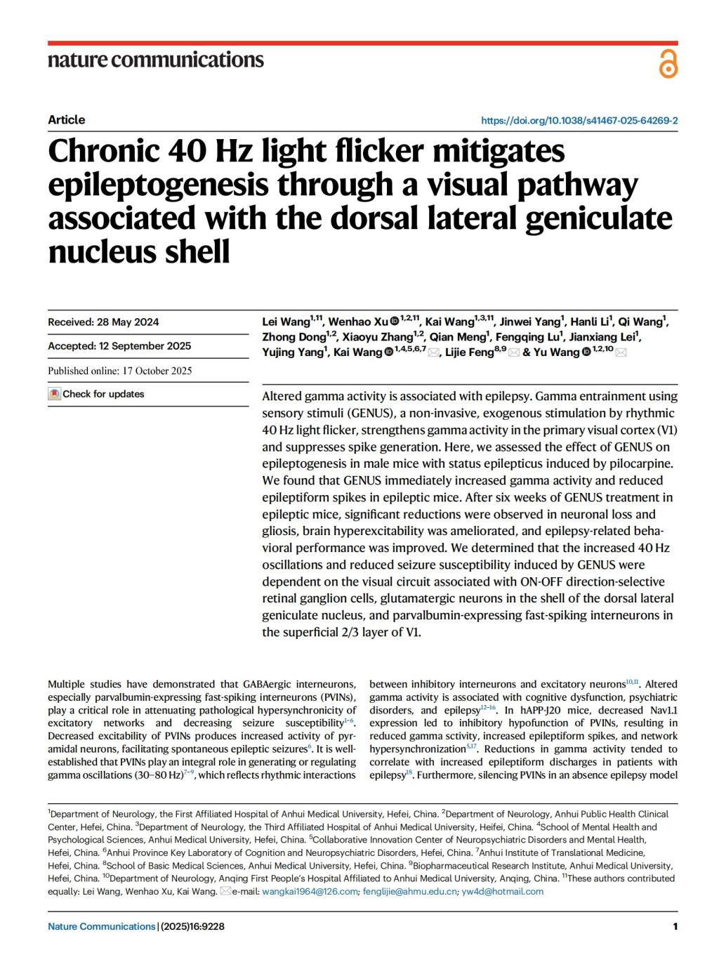 今年10月,安医大一附院神经内科团队在国际顶刊《自然通讯》(Nature Communications)发表研究型论文,题为《40 Hz闪光刺激(GENUS)通过特定的视觉环路改善癫痫的发生发展》(Chronic 40 Hz light flicker mitigates epileptogenesis through a visual pathway associated with the dorsal lateral geniculate nucleus shell)。该院博士研究生汪雷、硕士研究生许文豪和博士研究生王凯为共同第一作者,我院副院长、神经内科王玉教授,安医大一附院神经内科汪凯教授,安医大基础医学院冯利杰教授为共同通讯作者,安医大为该研究的独立完成单位。