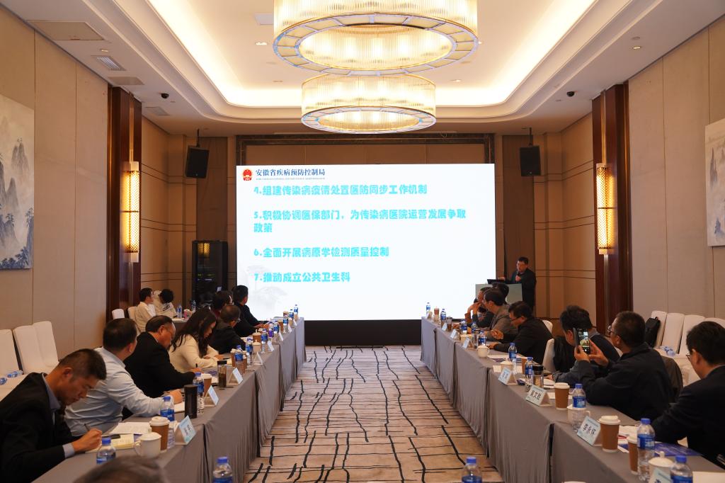 会议围绕传染病医院高质量发展进行了深入交流。我院院长李永怀作《聚力公卫临床创新,共筑健康中国基石》汇报,从当前的新挑战与新机遇背景下,结合安徽省公共卫生临床中心实际工作开展,介绍了“感染+、传染+”模式的相关实践和探索,并提出公共卫生临床中心未来发展路径。我院院长助理陆震从基本情况、全面提升会诊转诊服务水平对安徽省公共卫生临床中心感染性疾病(传染病)会诊转诊中心建设相关建议进行介绍,同时展示了会诊转诊中心详细工作流程。马鞍山市第四人民医院院长姚献虎、阜阳市第二人民医院院长李秀勇就本地传染病医院的基本情况、项目开展以及医院高质量发展经验进行了分享。各传染病医院主要负责人围绕传染病医院传染病防控综合服务能力提升进展进行交流研讨。