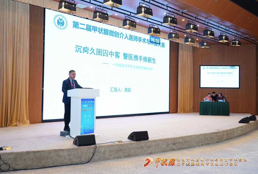 在总决赛中,黄磊汇报的病例题为《沉疴久困囚中客,警医携手焕新生——一例继发性甲旁亢的射频消融治疗》。他以清晰的时间轴为主线,系统梳理了诊疗全程的临床思路:从术前借助超声造影进行精准评估、组织多学科会诊确定方案,到术中精心设计并实施双侧甲状旁腺消融策略,以及术后严格的随访管理。整个汇报逻辑严密、数据详实,全面展示了我院在超声引导精准穿刺、靶点消融与重要功能结构保护方面的扎实技术积累,生动体现了“以最小创伤获取最佳疗效”的微创介入理念,赢得了全国权威评审专家的一致认可。