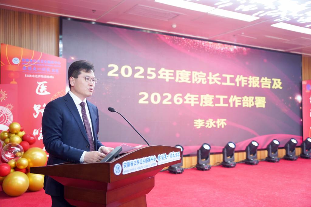 李永怀从党建工作、医疗服务、学科建设、人才发展、科研教学、文化建设等方面对医院“十四五”时期及2025年度工作进行全方位总结,并对2026年重点工作进行动员部署。展望2026年,他强调,全院上下要牢牢把握历史时机,乘势而上,把实干自觉融入血脉、化为行动,以实实在在的业绩、扎扎实实的成效,全力推动新时代医院建设迈向更高台阶。要紧紧围绕省级公共卫生临床中心的功能定位与发展目标,严格对标“十五五”事业发展规划,聚焦核心发展思路,着力推进重大传染病医防融合科研平台建设,加快构建“防、控、治”一体化的重大疫情应对体系,持续强化临床专科与公共卫生学科群建设,切实履行好作为省级公共卫生临床中心综合性医院的职责担当。要坚定不移地朝着建设多学科融合、特色鲜明的现代化公共卫生临床中心迈进,奋力打开医院高质量、内涵式发展的崭新局面。