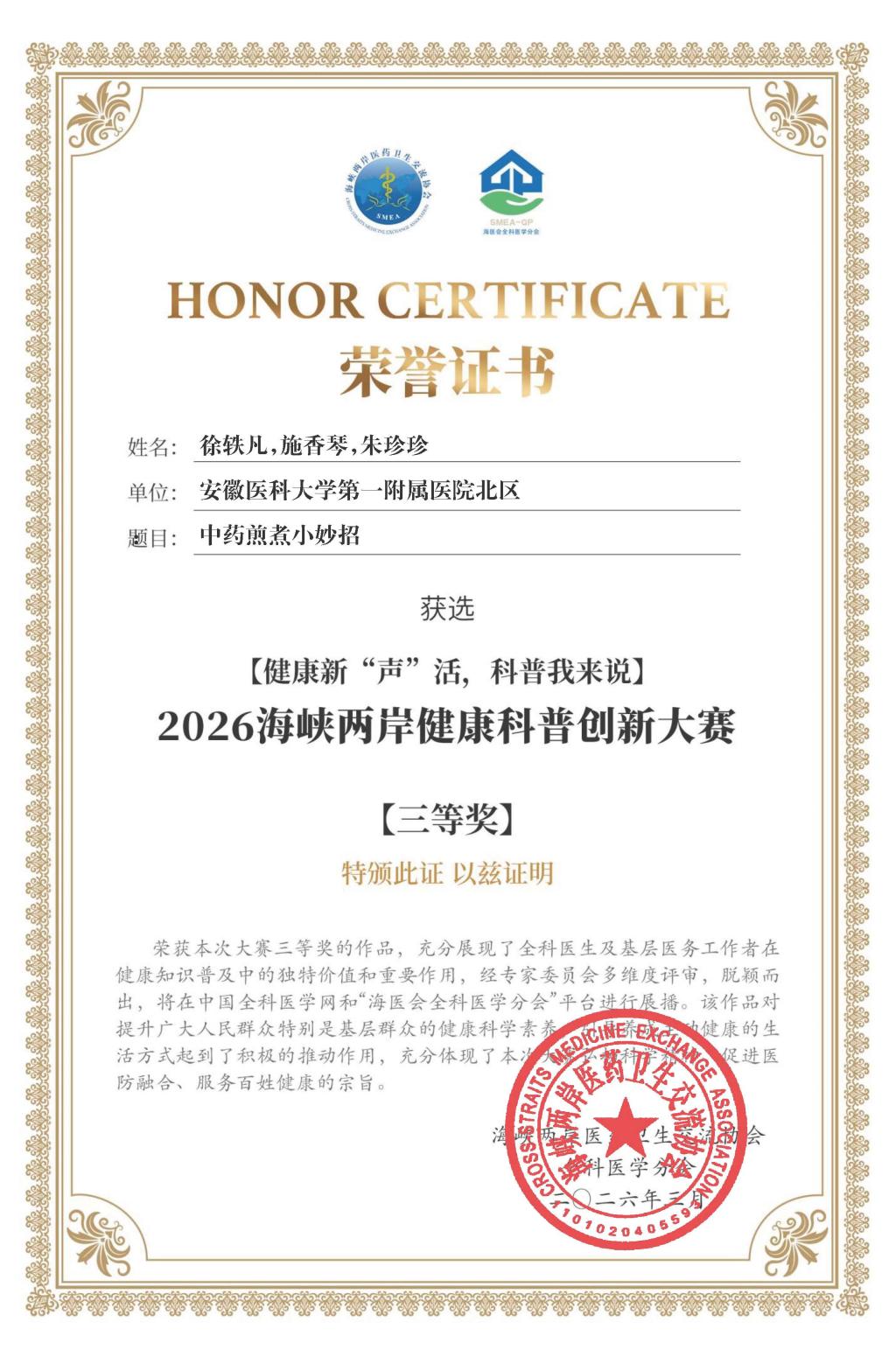 此次获奖是对我院健康科普工作的充分肯定。未来,我院将持续深耕中医药科普领域,推出更多优质科普内容,积极参与两岸中医药文化交流活动,以科普之力守护群众健康,为两岸健康事业融合发展贡献力量。(药学部 张伦)