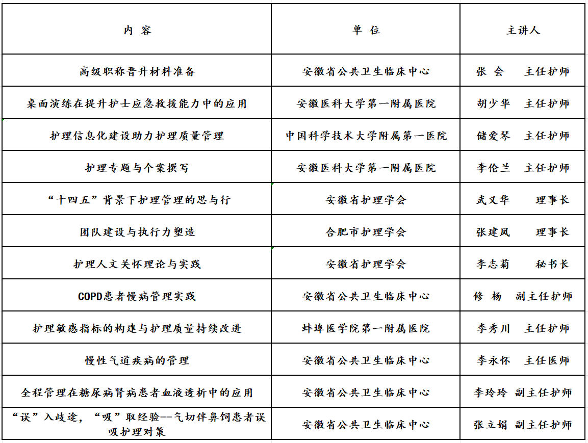 本次培训班荣幸地邀请到安徽省护理学会理事长武义华、合肥市护理学会理事长张建凤、安徽省护理学会秘书长李志菊、安徽医科大学第一附属医院护理专家李伦兰、胡少华,中国科学技术大学附属第一医院护理专家储爱琴,蚌埠医学院第一附属医院护理专家李秀川,安徽省公共卫生临床中心副院长李永怀、安徽省公共卫生临床中心护理专家张会、修杨、李玲玲、张立娟授课,专家们就课件中涉及的学术问题进行了热烈讨论。