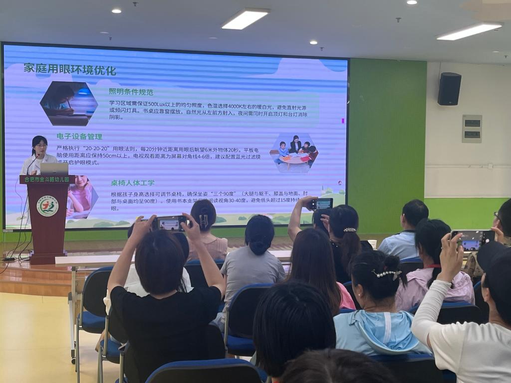 眼科副主任医师刘晓庆走进合肥市金斗路幼儿园开展健康讲座《近视的科学防控》,指导家长根据孩子身高调节桌椅,确保坐姿“三个90度”,守护用眼健康。家长们积极参与提问和讨论,现场互动氛围热烈。