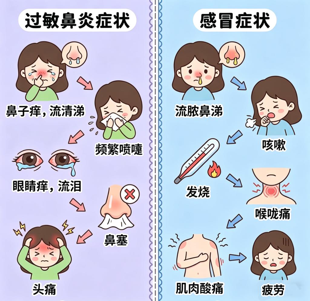 感冒常伴随发烧、咽喉痛、浑身乏力、肌肉酸痛等全身不适;过敏性鼻炎只有鼻痒、鼻塞、打喷嚏、眼痒等局部症状,不会出现发烧。